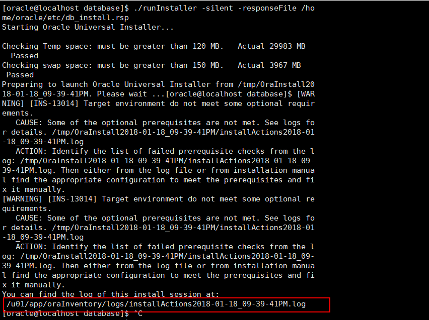 tail -f /u01/app/oraInventory/logs/installActions2018-01-18_09-39-41PM.log 查看安装日志。