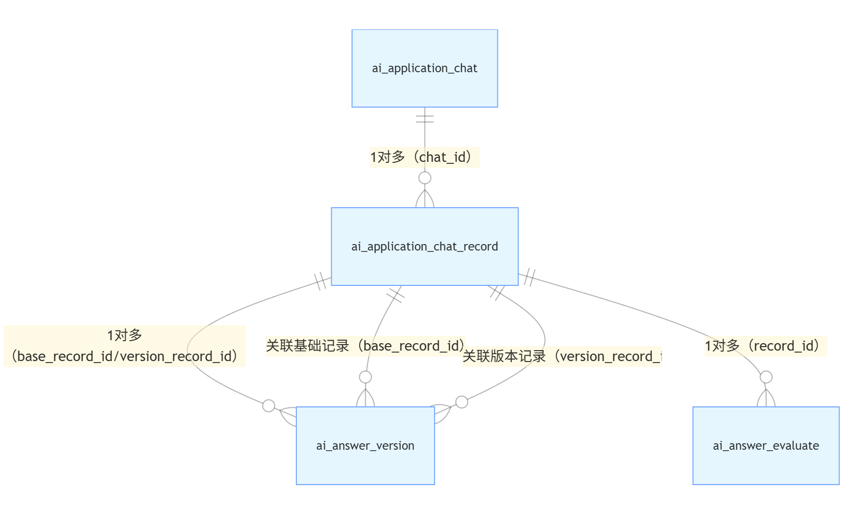 3. ai_application_chat_record(问答记录表) ↔ ai_answer_evaluate(评价表)